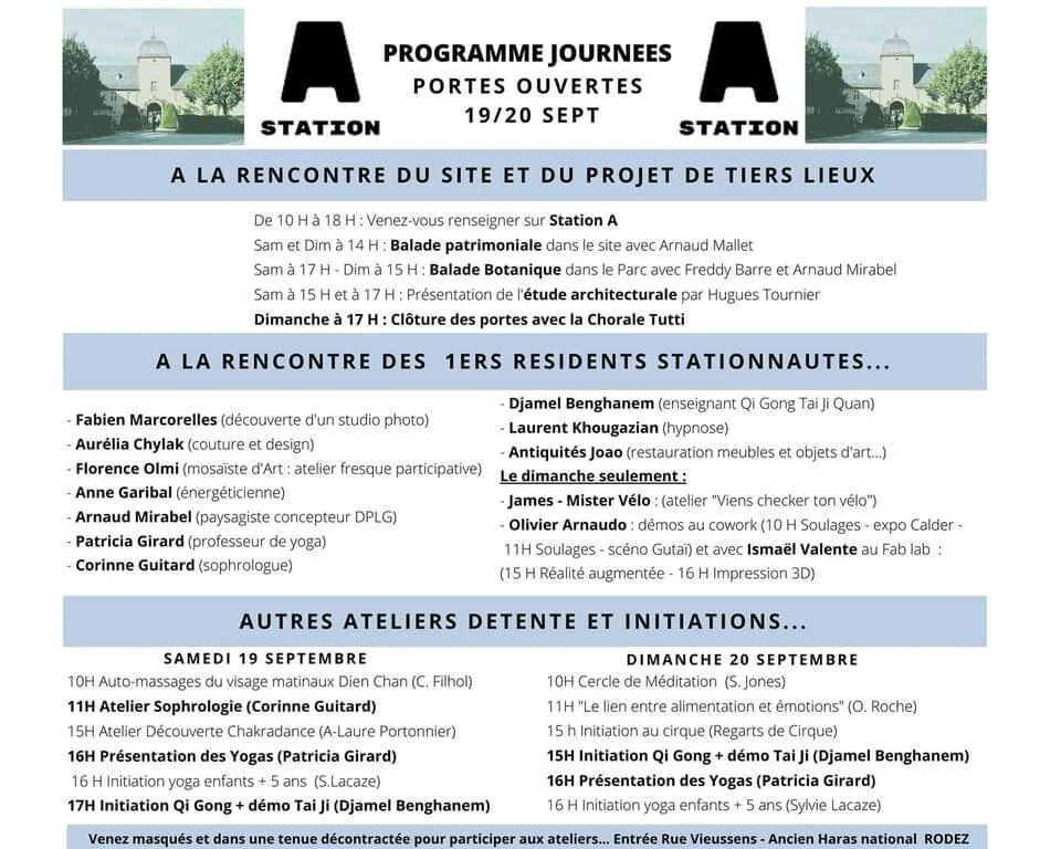 Journées du patrimoine samedi 19 septembre 2020 10:00 AM 10:00 dimanche 20 septembre 2020 6:00 PM 18:00 Station A Rue Eugène Loup Rodez, Occitanie, 12000 France (carte) Google Agenda ICS Journées du patrimoine Porte ouverte le 19 et 20 septembre à Station A. Pour plus d’informations : Station A